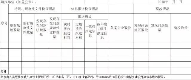 (一)自查階段。2018年4月2日至5月21日,各省級住房城鄉(xiāng)建設(shè)主管部門對照本通知確定的檢查內(nèi)容組織本地區(qū)自查,及時發(fā)現(xiàn)和整改有關(guān)問題,提出相應(yīng)對策措施,并于5月30日前將本地區(qū)自查報告及建筑企業(yè)跨省承攬業(yè)務(wù)監(jiān)督管理專項檢查匯總表(詳見附件)報住建部建筑市場監(jiān)管司。