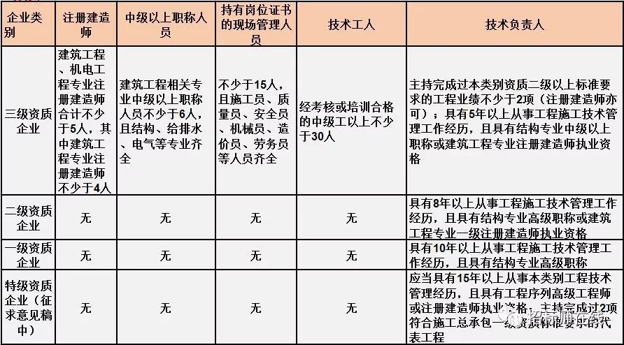 換句話說,并不是所有企業資質都不要求有建造師等企業人員。施工總承包三級資質企業對建造師等人員仍有要求,一級資質、二級資質企業保留技術負責人這一項要求,特級資質另有規定。